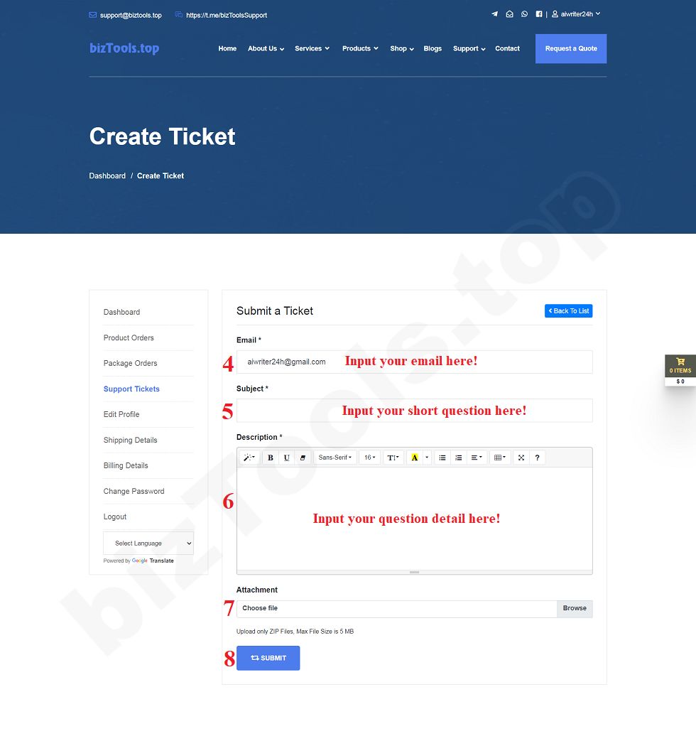 + Second step: In new window, you need input your question into all box of new support ticket form like the image bellows: