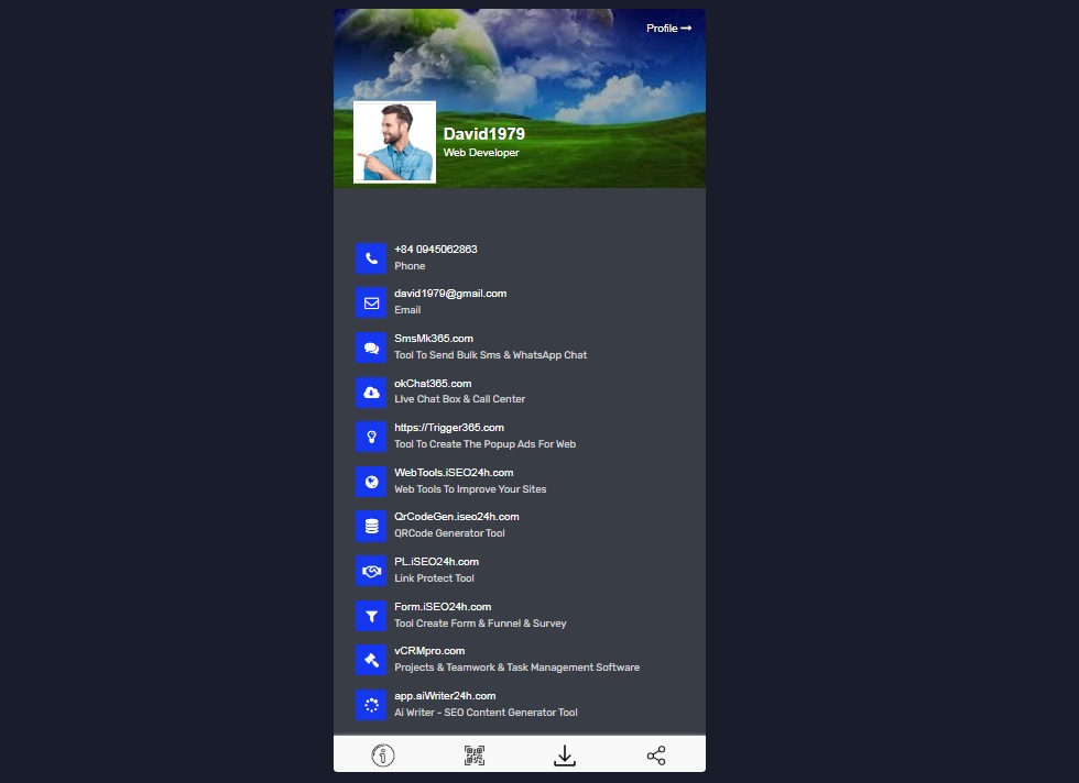 + Create Digital Business Cards and Digital Profiles: Enables users to create professional digital business cards and digital profiles, helping clients understand and trust them better, thereby increasing business opportunities.