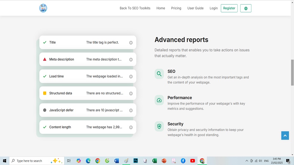+ Performance Reports: Evaluates key performance metrics of the website and offers recommendations to enhance page loading speed and user experience.