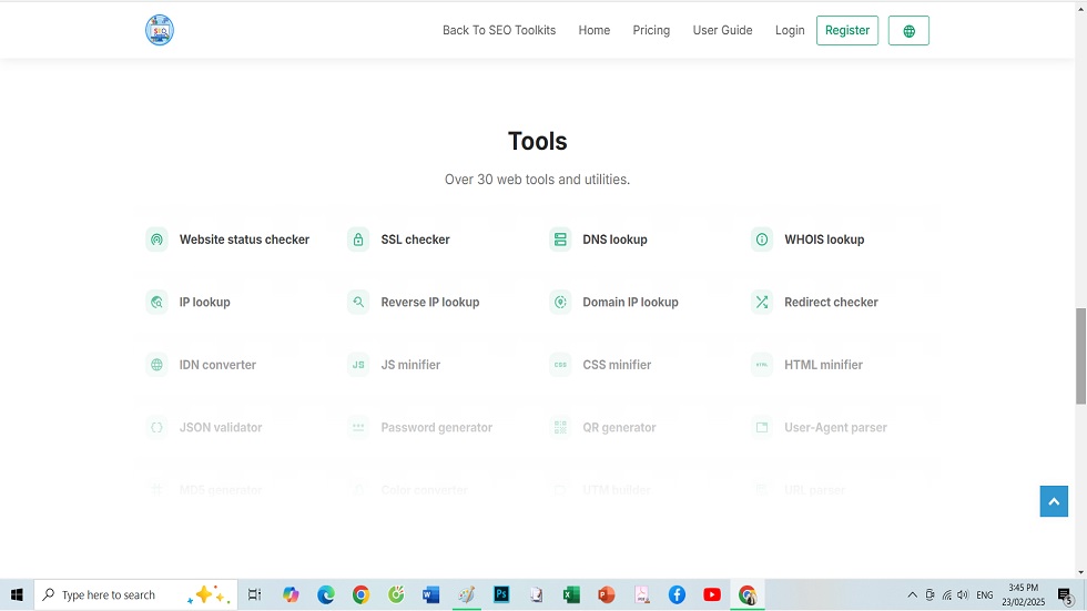 + Diverse Toolset: Offers over 30 web tools and utilities, including website status checks, SSL verification, DNS lookup, WHOIS lookup, IP lookup, and many other tools to assist with website analysis and optimization.